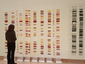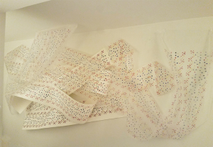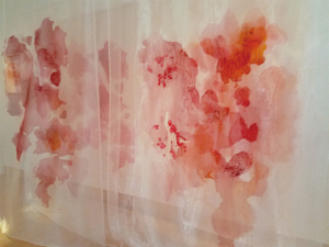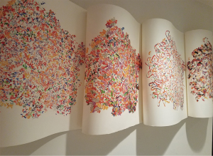 As a chemist and artist, I experiment with expressing environmental concerns on the most basic molecular levels. Using microscopes and collaborative laboratory data, I focus on the stress on DNA and proteins in the changing environment (Figure 1,2). Collaborating with scientists, I create art based on specific scientific models. My process begins by adopting the old tradition of nature drawings that I modify by constantly searching for new materials. I take the small structures that we cannot see and gives them color and volume. I layer and magnify (Figures 1-3) the scientific imagery to human scale, preserving its biological integrity. Considering their frailty, I give a new presence to these previously invisible, living formations. The soft installations and fragile materials examine the delicate balance that is essential for bio-structures and their vitality (Figures 3-5).