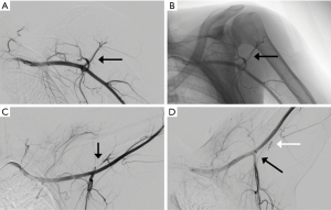 MRI has traditionally been used to demonstrate fatty atrophy of the teres minor or deltoid muscles (4,10). Typical findings on T1 weighted sequences include atrophy and fatty infiltration (Figure 2) but space occupying lesions such as neuromas, tumors, hypertrophied adjacent muscles or vascular aneurysms may be seen. T2-weighted sequences, typically fast spin-echo with fat suppression are used to detect abnormalities such as paralabral cysts. Diffuse increased T2 signal in the teres minor may suggest neurogenic edema consistent with QSS. MR angiography (MRA) can be used similarly to CTA to identify vascular abnormalities in the PCHA and distally in the arm. MRI has also been described as a possible modality to evaluate for axillary nerve compression, particularly at high fields such as 3 Tesla (11). Contributing shoulder pathologies such as rotator cuff or labral pathology can be identified by MRI or MR arthrography. In the case of MR arthrography, contrast is injected directly in the shoulder joint with fluoroscopic guidance followed by MR imaging, making it more sensitive for tears and paralabral pathology. Cahill and Palmer suggested the use of angiography as a diagnostic tool (1). Fluoroscopic and digital subtraction angiographic images are obtained after intra-arterial contrast injection into the subclavian or axillary artery. Images are obtained in both the neutral and abducted/externally rotated positions. The PCHA may be attenuated or entirely occluded with findings more pronounced in the abducted position (Figure 3). For non-acute patients suspected of QSS, diagnostic angiography could also identify chronic arterial changes such as aneurysm formation, dissection or partially occlusive thrombus allowing for intervention prior to the appearance of emboli or acute occlusion. In the acute stages, peripheral ischemia from emboli originating in the PCHA may be present with angiography showing complete arterial occlusion or aneurysm formation in the PCHA. In these patients, angiography is not only diagnostic, but allows for immediate intervention such as with thrombolysis.