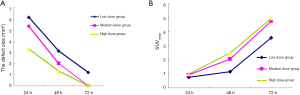 The images were analyzed using SIEMENS Inveon MM IRW image infusion software to calculate the VOI. Table 2 and Figures 4,5,6,7,8A show the VOIs of the low-, medium-, and high-dosage TFFC groups. Low-, medium-, and high-dose TFFC can protect the myocardium. High-dose group achieved the best effect. Table 3 and Figure 8B show the SUVmean at the site of myocardial ischemia of the low-, medium-, and high-dose groups at each time point. The SUVmean value at the site of myocardial ischemia increased with time, and metabolism was gradually recovered, thereby suggesting that low-, medium-, and high-dose TFFC can protect the impaired myocardium. High-dose group achieved the best effect.