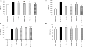 The levels of serum oxidative stress indicators (i.e., SOD and MDA) and the activities of myocardial enzymes (CK and LDH) of rats in each experimental group are shown in Table 4 and Figure 9.