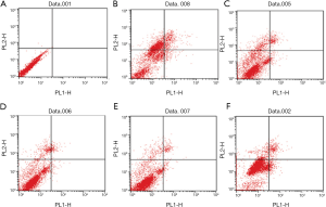 (I) The cells in good status were digested with 0.25% trypsin. After the cell density was adjusted to 6×105 cells/mL, these cells were inoculated into a 6-well plate. A total of 1 mL of cell suspension were added into each well. After taking out the 6-well plate, the culture solution of each well was sucked into a centrifuge tube. A total of 1 mL of enzyme (0.25% trypsin + 0.03%EDTA) were introduced to each well for digestion. After these cells were fully digested, the medium in the same volume was added to stop the digestion before being transferred to the corresponding 15 mL centrifuge tube for centrifugation for 5 min at 1,000 r/min. (II) The cells were resuspended with 5 mL of precooled PBS and centrifuged for 5 min at 1,000 r/min. (III) The cells were resuspended with 1 mL of precooled PBS, and the cell solution was transferred to the corresponding 15 mL centrifuge tube for centrifugation for 5 min at 1,000 r/min. After PBS was discarded, the solution was resuspended with 100 µL of binding buffer. (IV) Four single-positive tubes were processed, as follows: a. single-positive tubes 1A and 2A (56 °C, 7 min) and b. single-positive tubes 1B and 2B (56 °C, 10 min). Other samples were double-stained (56 °C, 5 min). (V) Each tube was added with 100 µL of cell suspension. A total of 5 µL of corresponding dye were added as follows (Table 1).