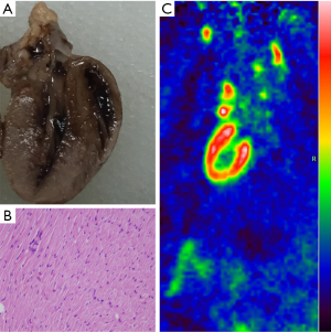 All model rats were sacrificed after completing imaging. Myocardial pathological observation was carried out by staining cardiac tissue with hematoxylin and eosin (HE). The isolated heart was washed with a fixative. The myocardial tissue on the left ventricular anterior wall was cut into strips and placed in a fixative for 2 h, then rinsed with 0.09 mmol KH2PO4 for 15 min, and stored in this solution. Conventional progressive dehydration in alcohol, transparency in xylene, conventional paraffin embedding, and intermittent uniform slicing were performed in order. After HE staining, the change in myocardial pathological structure was observed under an optical microscope.