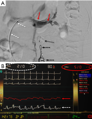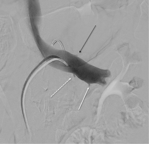 A comparison of DUS (LRV systolic velocity ratios) to CT (vein diameter ratios) demonstrates higher sensitivity and specificity of DUS findings (sensitivity of 80% vs. 69%; specificity of 94% vs. 89%, respectively) (34,36). However, invasive testing is frequently pursued for definitive diagnosis, as therapy could require invasive surgery. Venography with direct pressure measurements (Figure 7) (17), with or without intravascular ultrasound (IVUS), is considered the “gold standard” for diagnosis. However, even studies evaluating these methods utilized cystoscopy to confirm isolated left-sided hematuria (2). An elevated pressure gradient between the LRV and the IVC (≥3 mmHg) is the standard reference point by which venous hypertension is diagnosed (43). However, it should be noted that some patients may be symptomatic with “compensated” NCS, where compensatory flow through collaterals is large enough that only a borderline renocaval pressure gradient exists (2).