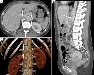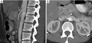 NCS has a suspected correlation to low body mass index (BMI), with some authors noting that symptoms resolve with increasing BMI (14). One explanation is a lack of supporting mesenteric fat, which otherwise lifts the bowel and raises the angle of the SMA. Another suggestion is a correlation to renal ptosis, a condition in which the kidney descends within the retroperitoneum upon position change from supine to upright, has been implicated in LRV “stretching” over the aorta and subsequent venous congestion (15). A lack of supporting retroperitoneal fat in these patients may contribute to renal “descent” (16).