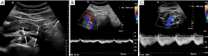 The screening examination of choice is DUS, offering both anatomic and physiologic assessment of the LRV absent radiation. However, the technique can be challenging, requires 6–8 hours fasting, and definitions vary depending on position (supine versus upright) (33). Reference ratios are slightly higher in the upright position, thought to be related to gravity acting on bowel and mesentery, pulling the SMA downward and pronouncing the LRV stenosis. Peak systolic velocity (PSV) is evaluated in the compressed, AM LRV and compared to hilar PSV. Various ratios have been proposed as significant, ranging from 4.0:1 to 5.0:1 (Figure 4) (34-36).