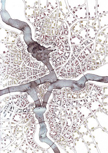 Emily Garfield creates intricate maps of imaginary places that explore the origins of cities and the function of maps themselves. Her drawings are inspired by the visual language of maps and the fractal similarity that cities share with biological processes such as the patterns of cells and neurons. She has participated in exhibitions and taught workshops at venues including the Map Center at the Boston Public Library, the DeCordova Museum, the Peabody Essex Museum and the Snite Museum of Art at Notre Dame. She was the 2014 director of the Somerville Open Studios city-wide arts event, and now lives in New York where she helps to produce the Tribeca Art + Culture Night art festival. Emily Garfield received her BA in Visual Arts from Brown University, where she also studied the aesthetic response through cognitive science.